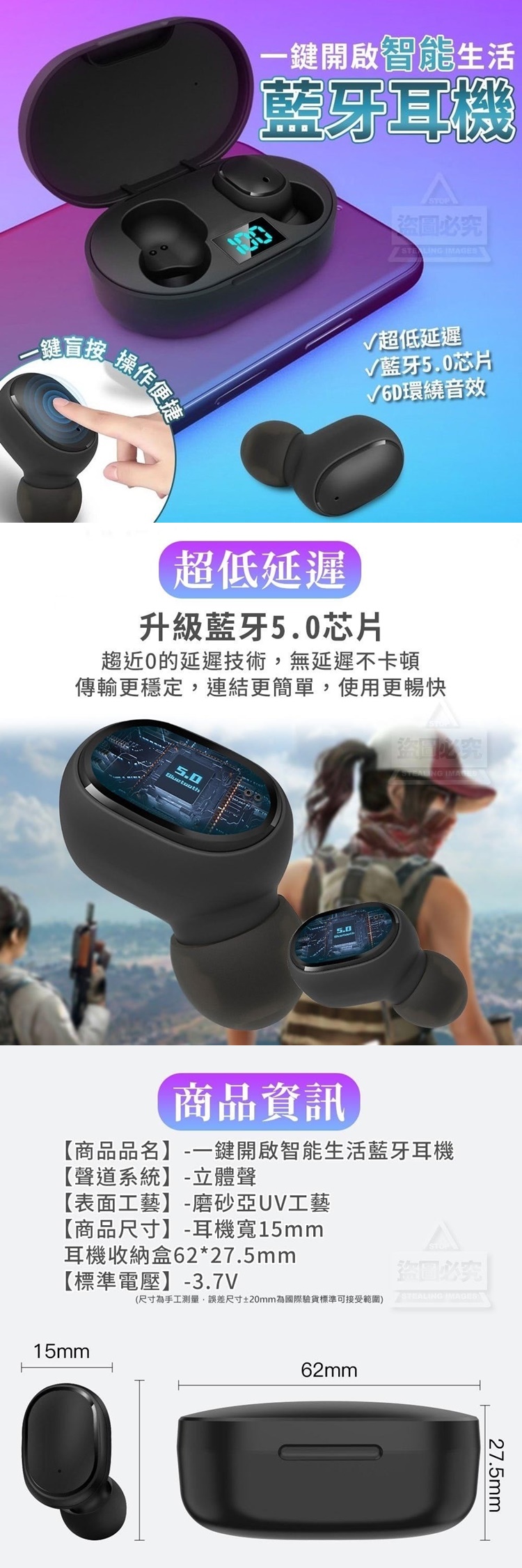 【充電方式】-充電0.5h、可使用1.5-2h【聲道系統】-立體聲【表面工藝】-磨砂亞UV工藝【商品尺寸】-耳機寬15mm/耳機收納盒62*27.5mm【標準電壓】-3.7V(尺寸為手工測量,誤差尺寸±20mm為國際驗貨標準可接受範圍)【商品說明】-