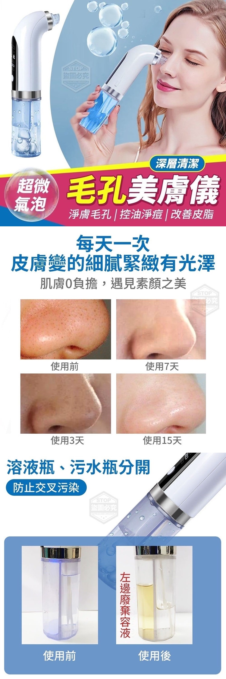 【商品說明】- 別再用“乾吸“黑頭儀 去黑頭了 不僅會使皮膚紅腫 更會破壞毛囊 使毛孔變得更粗大 超微氣泡深層清潔毛孔美膚儀 有效吸出黑頭,油脂汙垢 專業S型真空負壓濕吸技術 快速吸走毛孔黑頭、 油脂污垢、老化角質 每天一次 皮膚變的細膩緊緻有光澤 肌膚0負擔,遇見素顏之美 水壓清洗毛孔殘留 高水壓二次清洗毛孔殘留垃圾 讓每個毛孔都能呼吸到新鮮空氣 溶液瓶、污水瓶分開 防止交叉污染 淨膚毛孔 控油淨痘 改善皮脂 影片僅供參考使用方式 所有配件以實際收到為主