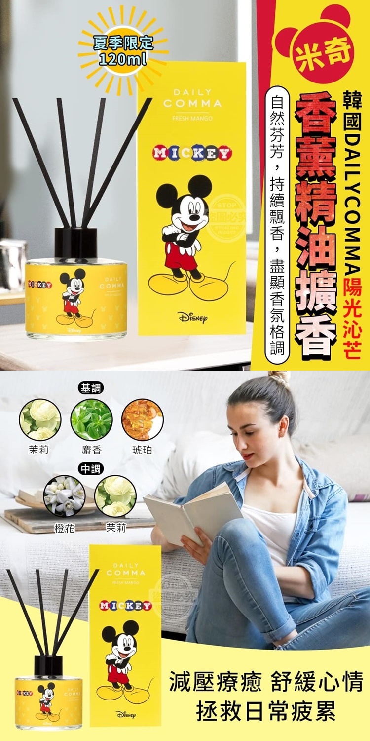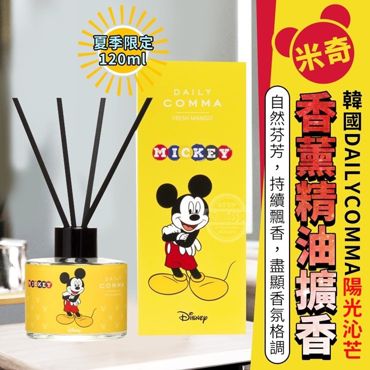 【商品說明】- 日常生活中有各種異味 香菸味、新屋裝修、食物、寵物等 這些味道影響心情,無法好好放鬆 來自韓國!夏季限定! DAILYCOMMA陽光沁芒 米奇香薰精油擴香120ml 基調:茉莉 麝香 琥珀 中調:橙花 茉莉 嚴選多種花朵香味調配的精油 植物清新香氣 自然持久且舒適好聞 聞起來真的好舒服~ 清新淡雅香氣 放在浴室、臥室、客廳等各場合 讓你享受悠閒時光 減壓療癒 舒緩心情 拯救日常疲累 產地 韓國 效期 2023.08