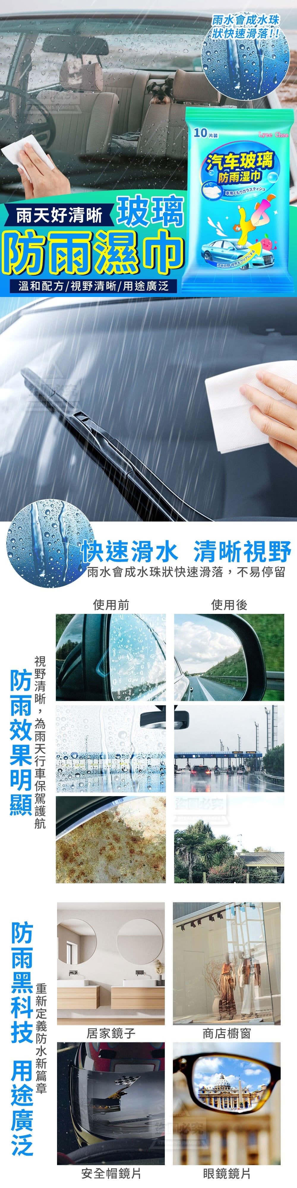 一包10入【商品說明】-視線不清是行車的大忌!行車視線模糊,車禍概率會大幅上升!雨天好清晰玻璃防雨濕巾一擦防雨,減少雨水在玻璃表面附著雨滴直接飛走不停留,讓你安全出行~快速滑水 清晰視野雨水會成水珠狀快速滑落,不易停留溫和不腐蝕,不傷車、不傷手溫和配方,不含有害物質,使用不傷玻璃防雨效果明顯視野清晰,為雨天行車保駕護航防雨黑科技,用途廣泛居家鏡子/商店櫥窗/安全帽鏡片/眼鏡鏡片重新定義防水新篇章影片僅供參考使用方式所有配件以實際收到為主