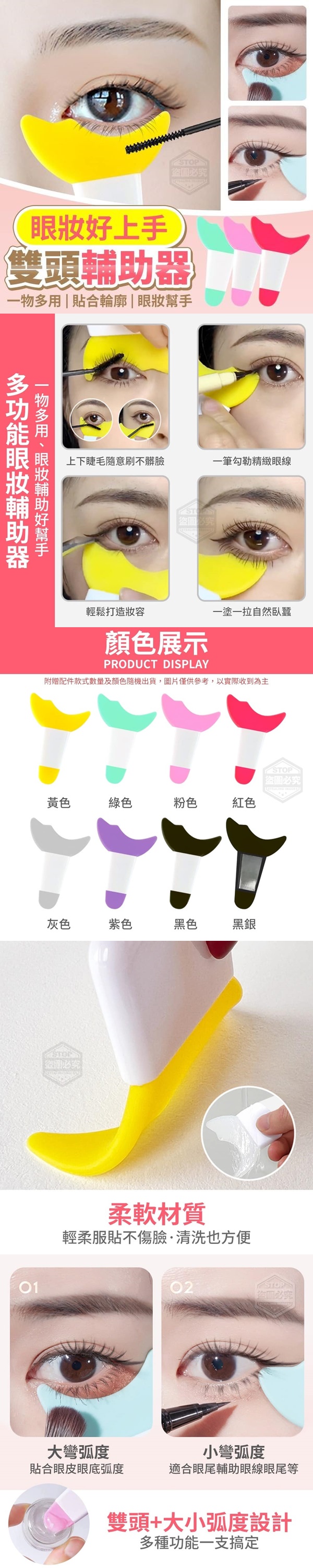 打造乾淨妝容的好幫手!眼妝好上手雙頭輔助器輔助畫日常眼線、刷上下睫毛膏還可以做擋板防止眼影粉掉落臉頰兩段弧度設計大彎弧度:貼合眼皮眼底弧度小彎弧度:適合眼尾輔助眼線眼尾等小頭可塗抹面膜等一物多用、眼妝輔助好幫手柔軟材質濕巾好擦拭,方便清潔月牙外觀設計精準貼合眼部輪廓兩段弧度設計貼合眼部更多角度部位需求一物多用貼合輪廓眼妝幫手影片僅供參考使用方式所有配件以實際收到為主
