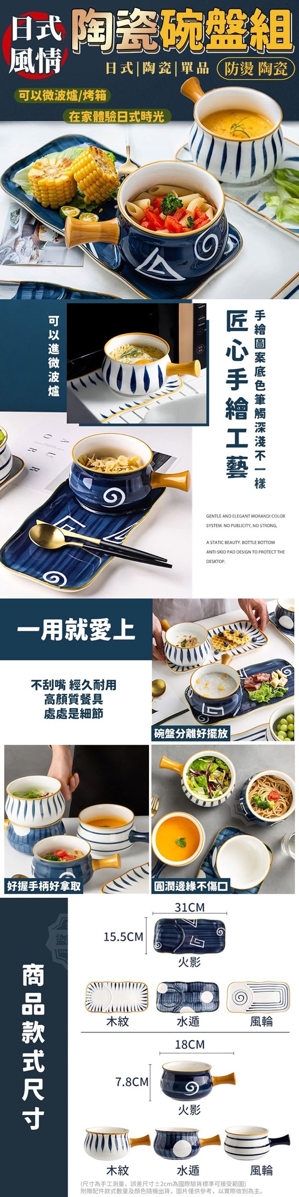 隨機出貨【商品尺寸】-把手碗 12CM * 7.8CM 把手6CM / / 分隔盤 31*12.5*1.9 CM(尺寸為手工測量,誤差尺寸±2cm為國際驗貨標準可接受範圍)【商品顏色】-木紋 / 風輪 / 火影 / 水遁(附贈配件款式數量及顏色隨機出貨,圖片僅供參考,以實際收到為主。)【商品材質】- 陶瓷【商品說明】-日式X陶瓷X單品好日系!!簡約的造型裝飾生活之美現在人吃美食之前都要拍照~那就很需要這款超好看的餐具!拍照晒圖隨手拍都好看~~高顏質餐具秒變成美食達人美食隨手拍~照片輕鬆成為焦點!適合擺拍提升餐桌格調!秀美食~~~在家體驗日式時光想在家就能體驗 推薦這一款 自然別緻的和風圖案觸手可得的日式優雅可以微波爐/烤箱全套餐具可以進入微波爐/烤箱等 不用專門換容器啦!匠心手繪工藝一筆一畫皆有匠人手工繪製,手繪圖案底色筆觸深淺不一樣 超有質感!圓潤邊緣不刮嘴~ 經久耐用各種簡約造型 簡單有型!!慢生活就是這樣 恰到好處用這麼美的碗吃飯增加美味~~!!!