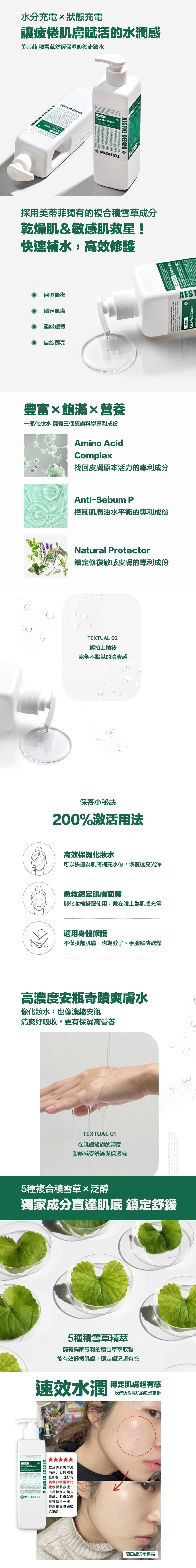 保濕,舒緩,收斂毛孔,完全是滋潤肌膚神器!添加積雪草萃取精華、法國產膠原蛋白、添加8種氨基酸,溫和不刺激,具有修復舒緩功能,滋潤補水、長效保濕,可舒緩敏感泛紅,令肌膚更水嫩飽滿,水分感up!up!""速效水潤"" 穩定肌膚超有感一次解決敏感肌的乾燥粗糙舒緩不適 穩定敏感肌膚強韌肌膚屏障滋潤補水,長效保濕控制油水平衡 收斂毛孔告別敏感,可幫助快速鎮定敏感肌膚五種積雪草積雪草提取物-舒緩敏感肌膚積雪草苷-油水平衡、呵護肌膚屏障積雪草酸-強化保濕、提供肌膚營養烴基積雪草酸-使肌膚柔嫩、打造柔嫩肌膚紋理添加泛醇為肌膚打造屏障,滋潤肌膚防治水分流失,維持肌膚狀態調解水油平衡,為疲備肌膚補充營養最適合族群因痘痘肌煩惱族群皮膚外部受刺激導致皮膚敏感可每天使用的溫和爽膚水改善泛紅、想保濕鎖水舒緩搔癢、紅腫皮膚使用方式:洗臉後使用,取適量均勻塗抹於臉上,輕拍至肌膚吸收。隔天即刻還你稚嫩肌膚產地:韓國