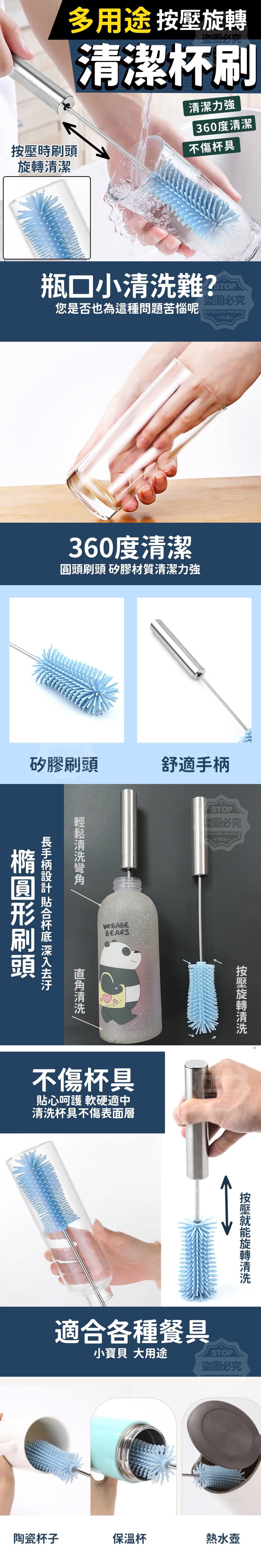 【商品說明】-瓶口小 洗污漬難?你是否也為這種問題而苦惱呢?交給這款按壓半自動清潔刷!旋轉同時清潔清潔力更強大長手柄設計 更能深入貼合杯底任意角度都不放過更能去除頑固污漬清潔彈性矽膠刷頭不傷軟硬適中 清洗杯具不傷表面層杯具/奶瓶/保溫杯等皆適用360度清潔深入去汙矽膠刷頭舒適手柄圓頭刷頭 矽膠材質 清潔力強~橢圓形刷頭方便清潔杯子等家用物品~一物多用 省的不只是一點點奶瓶/杯子/保溫杯/水瓶/花瓶..等等影片僅供參考使用方式所有配件以實際收到為主