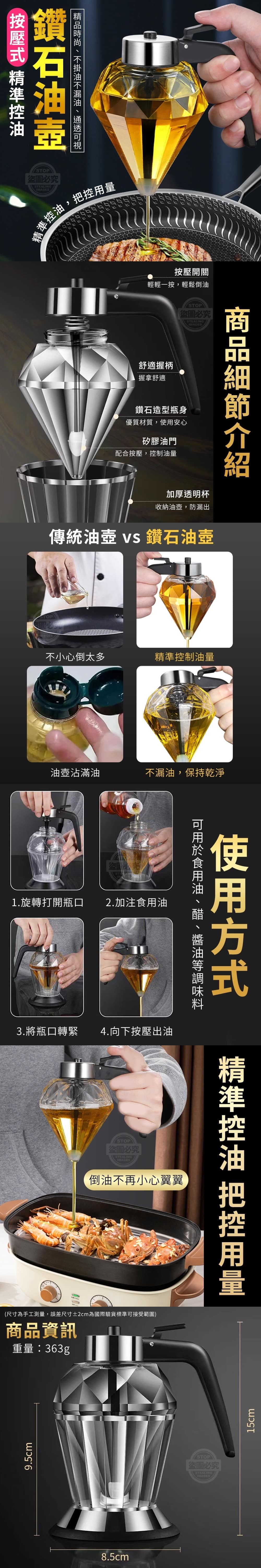 【商品容量】-200ml【商品材質】-玻璃+pp+矽膠+304不鏽鋼【商品尺寸】-15x8.5cm(尺寸為手工測量,誤差尺寸±2cm為國際驗貨標準可接受範圍)【商品說明】-倒油一不不小心就倒太多...瓶身沾滿了油弄得手油膩膩的....其實精準控油真的好簡單!廚界時尚精品按壓式鑽石油壺輕輕一按就能精準控制油量喔!輕鬆把控用量倒油不再小心翼翼而且單手就能操作讓你邊炒菜邊倒油讓烹飪變得更簡單了!!!倒油時不會漏油瓶身保持乾淨,手不再弄的油膩膩還有加厚透明杯可收納油壺,防油漏出滴落至桌面可用於食用油、醋、醬油等多種調味料喔!影片僅供參考使用方式所有配件以實際收到為主
