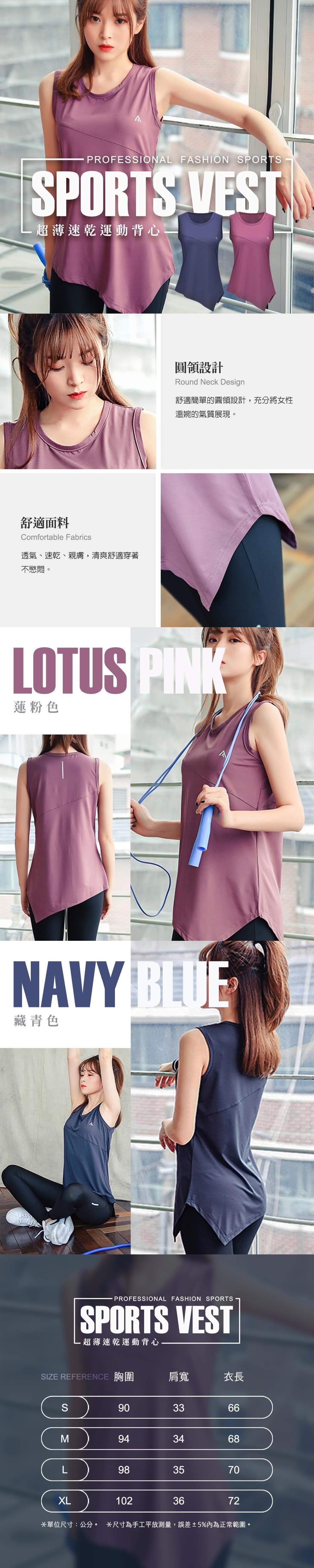 顏色:蓮粉色 / 藏青色 (顏色遇缺隨機)尺寸:S / M / L / XL台灣版型訂製款去年銷售量很高! 今年版型在修正符合台灣維加寬版,輕鬆舒適又顯瘦夏天就是要來幾件這種運動背心寬鬆涼感,舒適好穿無論怕熱的,不喜歡束縛感的愛運動的,很會流汗的都很推薦這件速乾的舒適感時尚的設計風柔軟舒適的彈力面料具有極佳吸濕性上健身房運動、做瑜伽、日常穿著都適合!顯瘦腰身設計,背部顯瘦設計,簡而收身,隨心運動,輕鬆無壓力。