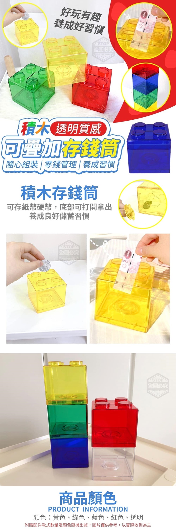 顏色隨機【商品尺寸】-8.8*9.2cm【商品顏色】-黃色、綠色、藍色、紅色、透明附贈配件款式數量及顏色隨機出貨,圖片僅供參考,以實際收到為主。【商品說明】-實用與玩樂兼具!讓孩子邊玩邊存錢~培養存錢好習慣!積木透明質感可疊加存錢筒可存紙幣硬幣,底部可打開拿出養成良好儲蓄習慣每個存錢罐都可以拼搭連接起來擺在家當裝飾品也是超級好看可疊加設計隨意疊加排列,有趣好玩透明質感內容物清晰可見堅固材質材質堅固耐用隨心組裝零錢管理養成習慣影片僅供參考使用方式所有配件以實際收到為主