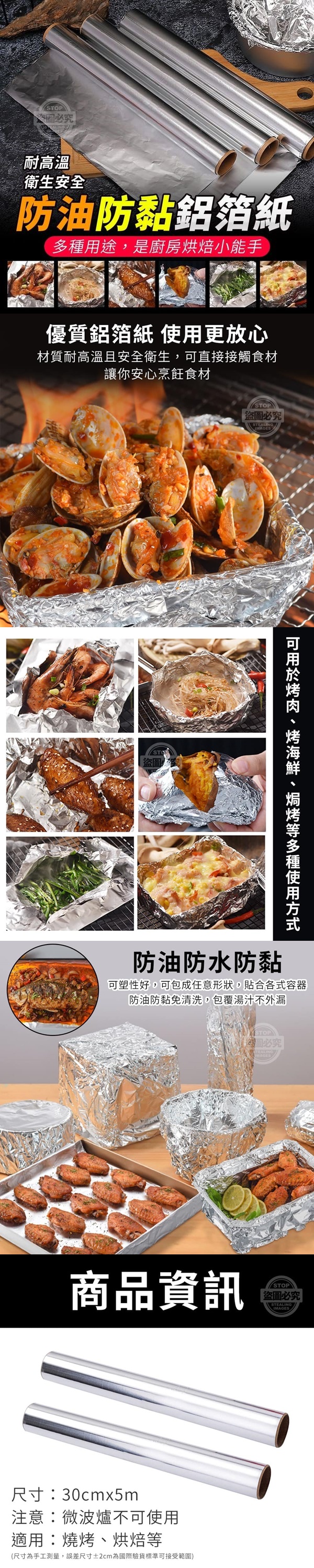 【商品尺寸】-30cm*5M(尺寸為手工測量,誤差尺寸±2cm為國際驗貨標準可接受範圍)【商品說明】-料理烘焙的好幫手!多用途防油防黏鋁箔紙厚度均勻,質地紮實~食物不易烤焦、不易沾黏~可塑性強,方便用於層層包裹食材!多功能使用場景可用於包裝、食材保鮮、燒烤烹飪或是搭配烤架做臨時烤盤等還可以放在烤箱底部接食物渣吸油健康安全放心使用可直接接觸食物,衛生安全讓您在使用時更省心更放心防油防水防黏讓您的生活更省心防油防水防黏鋁箔紙多種用途,你也是料理烘焙達人!>耐高溫>多種功能>安全材質影片僅供參考使用方式所有配件以實際收到為主