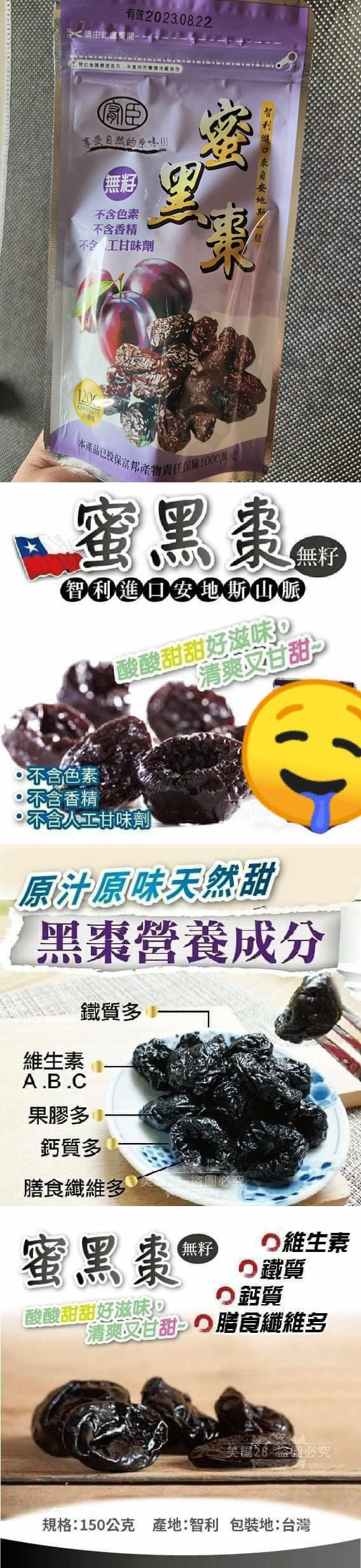 商品:無籽蜜黑棗 來自智利安地斯山脈 滋味酸甜清爽又甘甜 富含多種人體所需營養 維生素 鐵質 鈣質 膳食纖維 享受自然的原味 去籽且顆顆飽滿 不含色素 不含香精 不含人工甘味劑 最健康的小零嘴 幫助維持腸胃道機能 搭配優格也好吃 平價健康又美味 商品資訊 重量:約120g/包 產地:智利 包裝地:台灣 &最新效期&