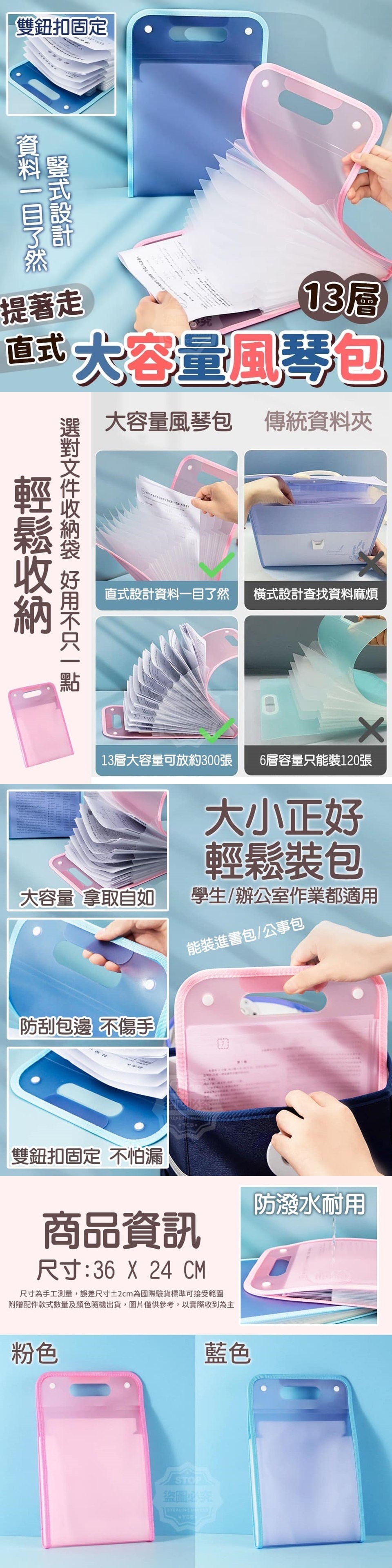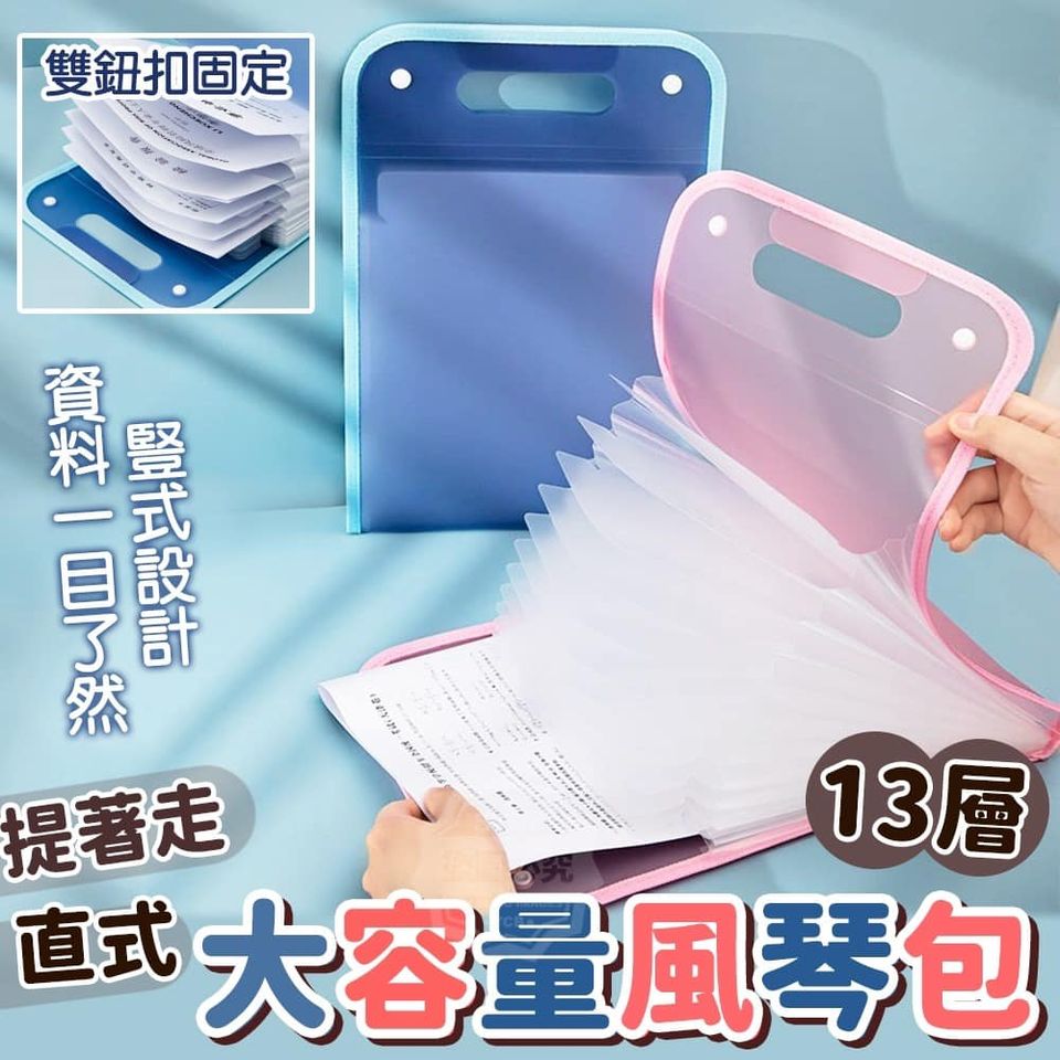 大圓角包邊設計不刮傷手,使用更安心雙鈕扣固定重要資料不怕漏 好開好拿大小正好能裝進書包/公事包手提設計好攜帶加厚提手,資料輕鬆拎著走防刮包邊 手提設計 防潑耐用防丟暗扣 13層大容量豎式設計 輕鬆裝包快速找出所需資料!上學/辦公室作業都適用!