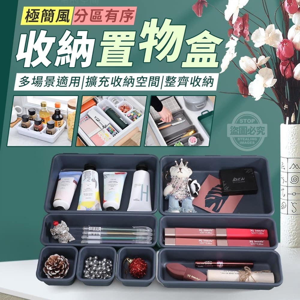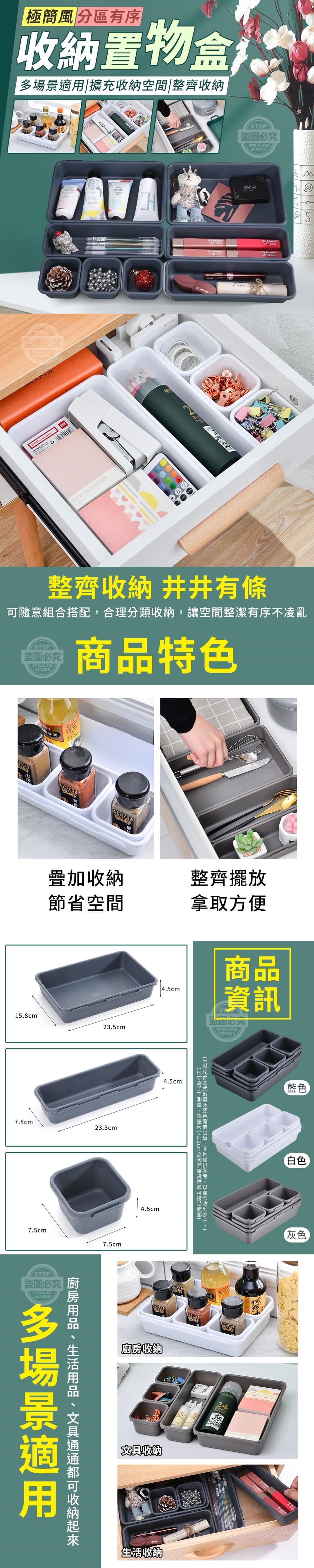 【商品尺寸】-大方形:23.5x15.8x4.5cm、長方形23.3x7.8x4.5cm、正方形:7.5x7.5x4.5cm(尺寸為手工測量,誤差尺寸±2cm為國際驗貨標準可接受範圍)【商品顏色】-藍、白、灰(附贈配件款式數量及顏色隨機出貨,圖片僅供參考,以實際收到為主。)【商品說明】-桌面凌亂?東西太多?需要總是找不到?收納盒不夠用?分區有序收納極簡風置物盒大方形收納盒+長方形收納盒+正方形收納盒可放在桌面或是抽屜裡不同大小形狀的收納盒可隨意組合搭配合理分類收納,讓空間整潔有序不凌亂也可以疊加收納使用節省檯面的空間整齊收納,東西擺在哪都一目了然無需翻箱倒櫃,拿取方便整齊收納 井井有條廚房用品、生活用品、文具等通通都可收納起來喔!影片僅供參考使用方式所有配件以實際收到為主