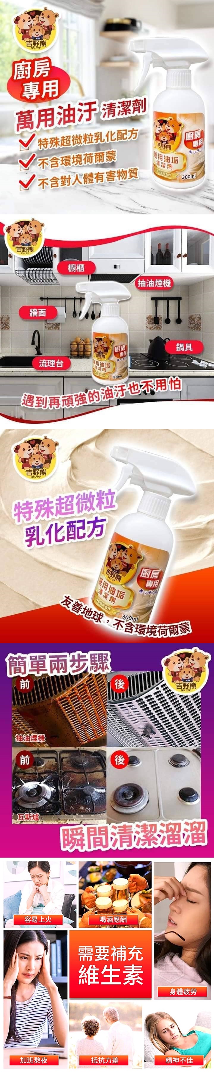 吉野熊-廚房油污去油噴霧 容量:300ml 產地:台灣 特殊超微粒乳化配方 友善地球,不含環境賀爾蒙 不含對人體有害物質 各種油汙空間皆可使用,遇到再頑強的油汙也不怕 流理臺牆面櫥櫃鍋具抽油煙機 強力除油,輕鬆去垢,廚房清潔,輕鬆搞定 噴後只要3~5分鐘,廚房的各種油污, 都可輕鬆抹淨不費力 針對頑強油垢、焦漬等污漬,噴後靜置一會,油污即可輕易溶出不粘黏 環境清潔,有「垢」輕鬆! 環保科技 除垢去汙 快速清潔 適用性廣