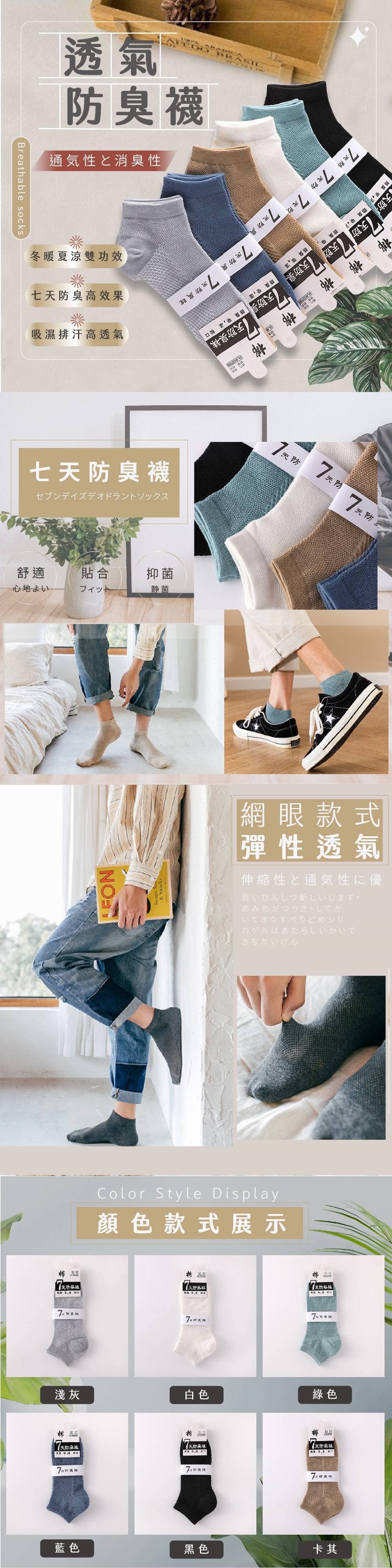 +1=1組有6雙為什麼七天防臭襪只有六雙?因為週日不用上班低調設計,但能穿出不平凡的質感簡約色系,6個顏色都好搭好看容易流腳汗,一脫鞋就有鹹魚味的人,一定知道選襪子的重要性一雙好的襪子,可以降低脫鞋的尷尬,透氣網格設計,吸汗好、透氣不悶熱,久穿舒適不悶臭襪口彈性十足,包覆感更好減少摩擦,行走更舒適強韌高彈襪口高彈襪口,貼合不下滑縫頭平整平整不卡腳,更舒適加固襪跟舒適貼合,不磨腳尺碼 : 36-44碼通用顏色 : 黑色、綠色、白色、咖啡、灰色、藍色 (如圖顏色各一雙)
