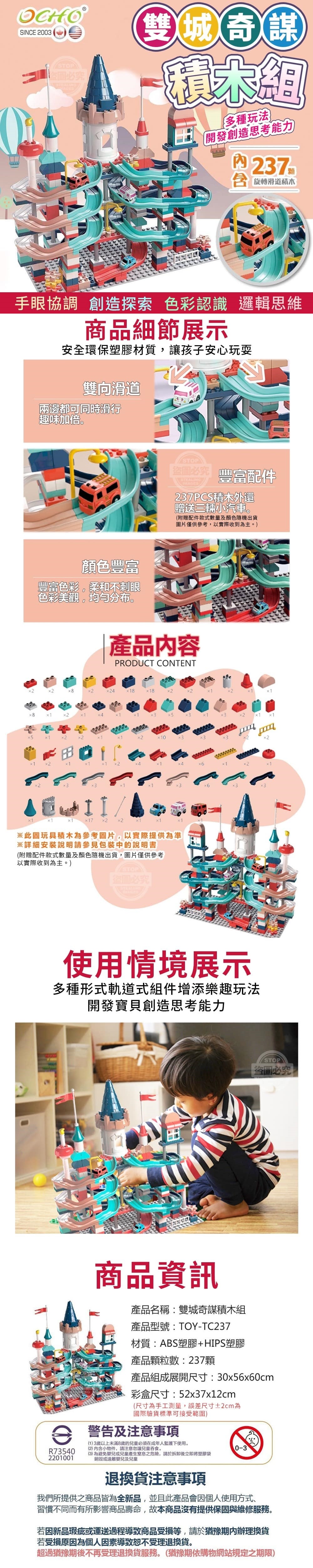【商品材質】-ABS塑膠+HIPS塑膠【商品尺寸】-組合展開30x56x60cm/彩盒52x37x12cm(尺寸為手工測量,誤差尺寸±2cm為國際驗貨標準可接受範圍)【商品顆粒數】-237顆(附贈配件款式數量及顏色隨機出貨,圖片僅供參考,以實際收到為主。)【商品說明】-色彩豐富,好玩又有趣的OCHO雙城奇謀積木組~多種形式軌道式組件增添樂趣玩法開發寶貝創造思考能力!從小培養起孩子的手眼協調、創造探索色彩認識、邏輯思維能力讓孩子學習贏在起跑點也可以與孩子一起玩耍創造屬於你們的親子快樂時光使用安全環保塑膠材質讓孩子安心觸碰玩耍雙向滑道兩邊都可同時滑行趣味加倍!內含237顆轉滑道積木隨你組合喔還有三輛小汽車可以在滑道奔跑!顏色鮮豔豐富,柔和不刺眼百變有趣讓孩子動手創造不一樣的!