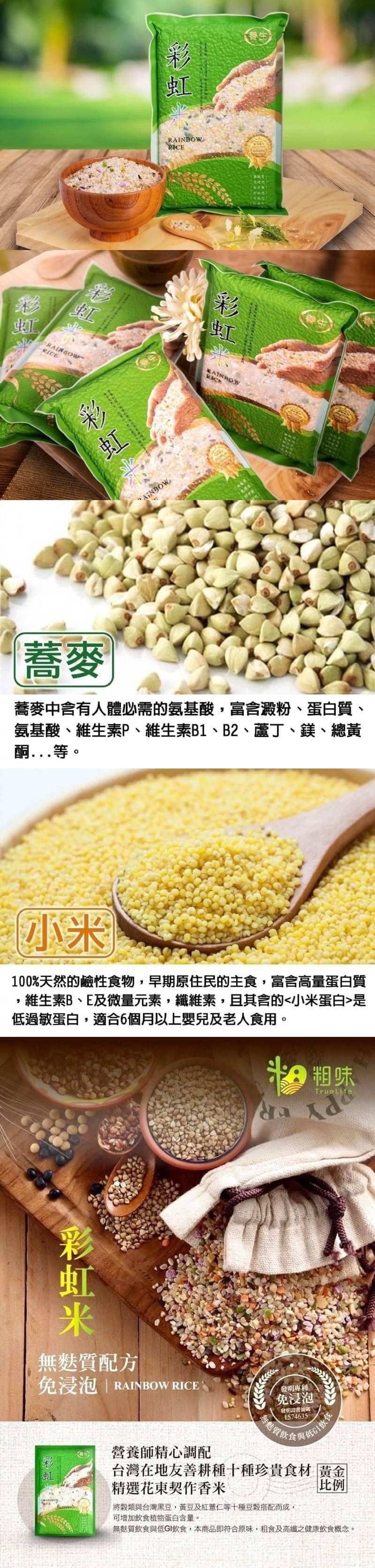 每天煩惱孩子營養素攝取不足嗎?每天擔心老公膳食纖維不夠嗎?全家人都愛的十穀米在哪裡買得到?小編今天真心推薦這款[養生彩虹米]全家人一定都愛吃,五種顏色搭配,讓超級植物多酚抵抗病毒入侵,絕不是外面容易買得到的珍貴穀物,每天至少一餐多穀飯長保腸道健康,身體免疫功能自然提升!!!感謝廠商全部給最高等級食材。電視台推薦標價一包250元今天防疫守護價,每包只要130元,給大家吃的健康平安~產品特色:將穀類與豆類結合,可提高飲食中植物蛋白質利用率及花青素比例台灣第一包無麩質配方,過敏體質可放心食用免浸泡發明專利,台灣已獲得免浸泡配方之專利,專利証號:1574634*重量:600g*保存期限:12個月*效期:最新成分:花蓮契作米、糙米、台灣黑豆、台灣黃豆、紅扁豆、紅薏仁、雪蓮子、蕎麥、黑米、小米、紫山藥煮法:直接烹煮和白米一起煮皆可,電子鍋:不用浸泡(水量多0.3杯)電鍋建議:浸泡10分鐘後再煮(和平常一樣的用水量+多半杯水)