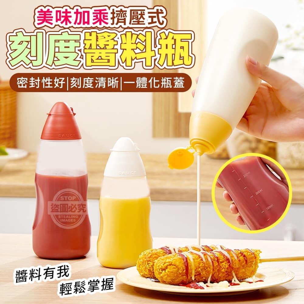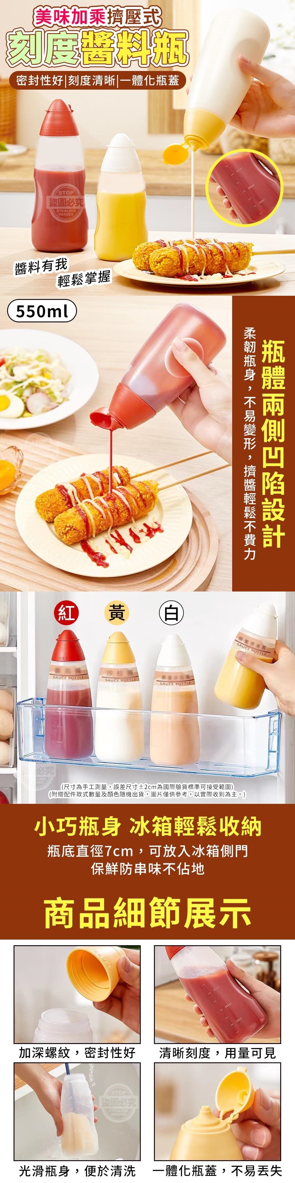 【商品材質】-PP、PE【商品容量】-550ml【商品尺寸】-瓶底直徑7cm,19.8*7.5cm(尺寸為手工測量,誤差尺寸±2cm為國際驗貨標準可接受範圍)【商品顏色】-紅、黃、白(附贈配件款式數量及顏色隨機出貨,圖片僅供參考,以實際收到為主。)【商品說明】-你還在這樣取醬料嗎?用量倒取難控制使用湯匙容易污染醬料瓶口溢出會弄髒手還要清潔麻煩美味加乘擠壓式刻度醬料瓶幫你解決以上小難題瓶體兩側凹陷設計柔韌瓶身,不易變形擠醬不堵塞,輕鬆不費力擠壓出來的醬料細膩又順滑喔!一體化瓶蓋+加深螺紋設計密封性好,醬料不易漏出使用簡單且不易丟失瓶身清晰刻度醬料用量清晰可見,用量好控制快用完也能即使補充光滑瓶身光滑不易藏污垢刷洗更方便小巧瓶身瓶底直徑7cm,可放人冰箱側門保鮮、防味、不佔地醬料有我,輕鬆掌握影片僅供參考使用方式所有配件以實際收到為主