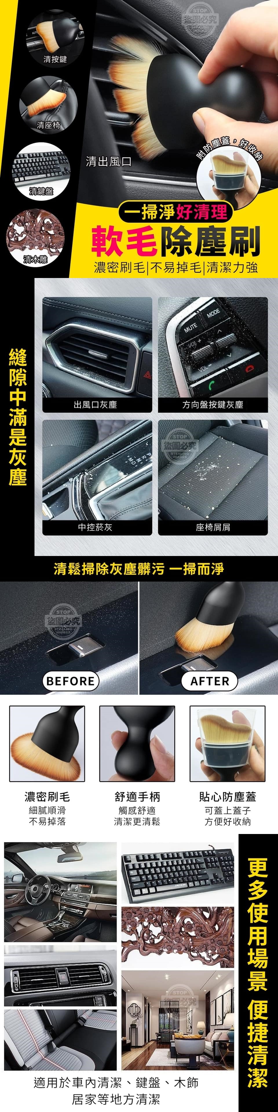 B 一掃淨好清理軟毛除塵刷 【商品說明】- 出風口灰塵、方向盤按鍵灰塵 中控菸灰、座椅屑屑 車內縫隙死角滿是灰塵,難以清除怎麼辦? 一掃淨好清理軟毛除塵刷 超濃密刷毛,細膩順滑不易掉落 可伸入縫隙輕鬆掃除灰塵髒污 掃一掃就變得乾乾淨淨! 手柄舒適,質感細膩 觸感舒適好拿取,清潔更清鬆 清潔力強,不只可用於車內清潔 還可以清電腦鍵盤、家中木飾 及居家等地方清潔 影片僅供參考使用方式 所有配件以實際收到為主