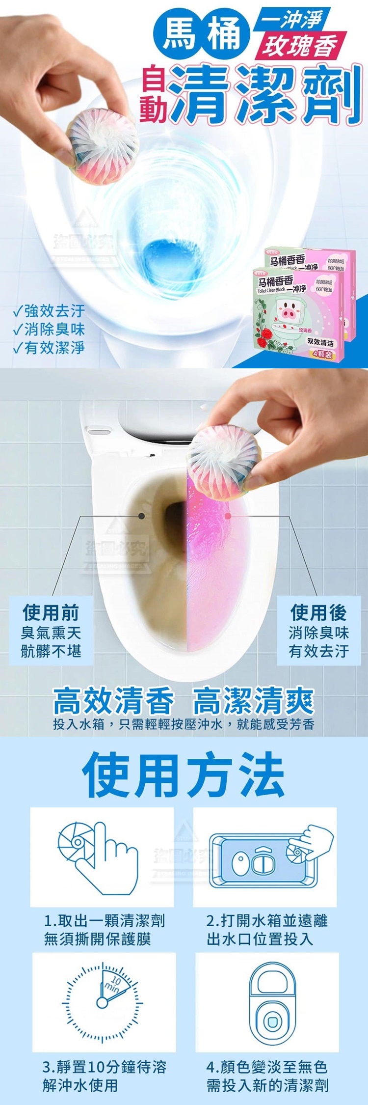 說到廁所清潔就頭好痛頑固汙垢,難以清潔異味難聞,臭氣沖天細菌滋生,危害健康一沖淨玫瑰香馬桶自動清潔劑為你解決生活煩惱!只需一「錠」輕鬆搞定!