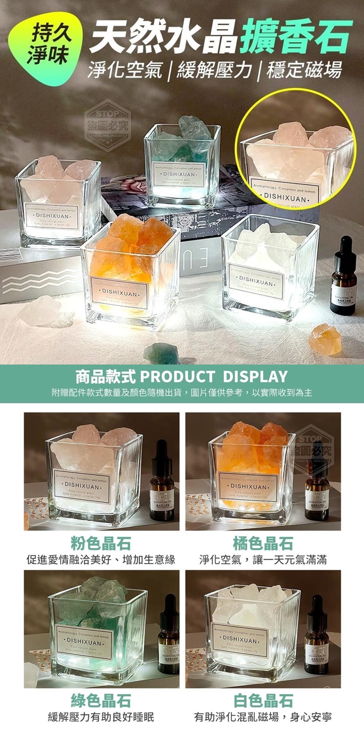 【商品材質】-礦鹽晶石【商品尺寸】-6*6cm尺寸為手工測量,誤差尺寸±2cm為國際驗貨標準可接受範圍【商品款式】-粉色晶石、橘色晶石、綠色晶石、白色晶石附贈配件款式數量及顏色隨機出貨,圖片僅供參考,以實際收到為主。【商品附件】-精油【商品包裝】-盒裝【商品說明】-凝聚自然的力量天生的香味載體天然水晶持久淨味擴香石水晶礦石本身有著良好的吸附能力可讓香味滲入石頭裡存儲著,並慢慢會發出香味把自然的味道搬回家可自行搭配滴入精油讓千里外的島嶼、森林、茶山、花田的氣息鋪面而來粉色晶石促進愛情融洽美好、增加生意緣橘色晶石淨化空氣,讓一天元氣滿滿綠色晶石保持清醒的天然力量緩解壓力有助良好睡眠白色晶石有助淨化混亂磁場,身心安寧適用多種場景客廳/臥室/洗手間/飯店釋放清新香氣,撫平一切煩躁和不安帶你身入奇境淨化空氣緩解壓力穩定磁場