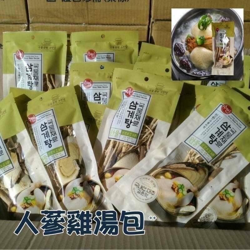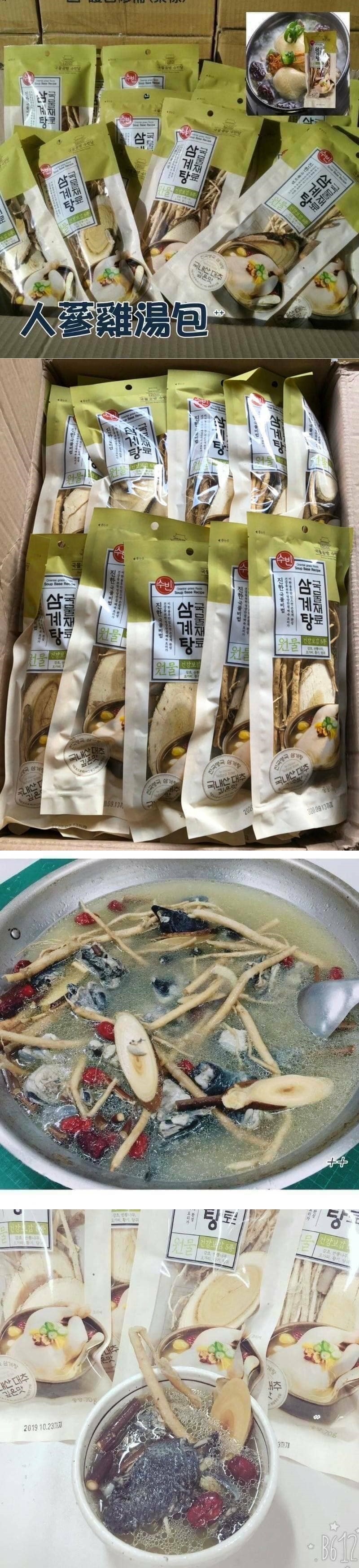 韓國人蔘雞燉材材料包 韓國 人蔘雞 燉材料包 天氣開始慢慢 轉涼了 大家都開始準備要補身體了!! 不會料理的人只要一包丟下去也能煮出超好喝的藥膳蔘雞湯 好喝極了,自已在家DIY在也不是什麼困難的事了 想吃排骨藥膳湯也不錯 也可以試著煮魚湯 聽說口感一級棒唷!! 所以你想吃什麼就自已料理什麼,重點湯頭很順口唷 食用方式: 藥膳包加水一鍋先煮30分鐘, 再加入雞肉(或排骨或其它肉類) 繼續燉煮30分鐘到一小時,少許鹽巴調味即可