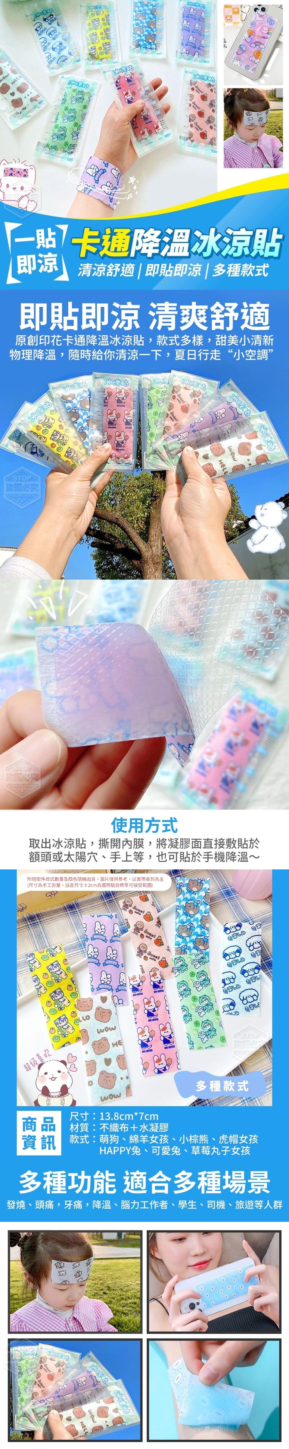 貼片素色無圖案【商品材質】-不織布+水凝膠【商品尺寸】-13.8cm*7cm(尺寸為手工測量,誤差尺寸±2cm為國際驗貨標準可接受範圍)【商品款式】-萌狗、綿羊女孩、小棕熊、虎帽女孩HAPPY兔、可愛兔、草莓丸子女孩附贈配件款式數量及顏色隨機出貨,圖片僅供參考,以實際收到為主。【商品說明】-一貼即涼卡通降溫冰涼貼創新印花,萌趣可愛,款式多樣甜美小清新風格,貼上清爽舒適、即貼即涼物理降溫,隨時給你清涼一下~夏日行走“小空調”多種功能,適合多種場景發燒、頭痛,牙痛,降溫、腦力工作者學生、司機、旅遊等人群都適用【使用方法】取出冰涼貼,撕開內膜,將凝膠面直接敷貼於額頭或太陽穴、手上等也可貼於手機降溫~不織布環保材料韌性好,穩定不溢膠,質感柔軟可愛卡通風萌趣又好看,增添日常小樂趣清涼舒適即貼即涼多種款式影片僅供參考使用方式所有配件以實際收到為主