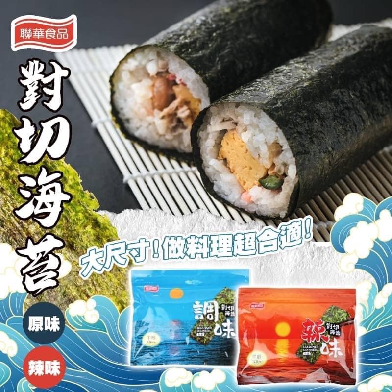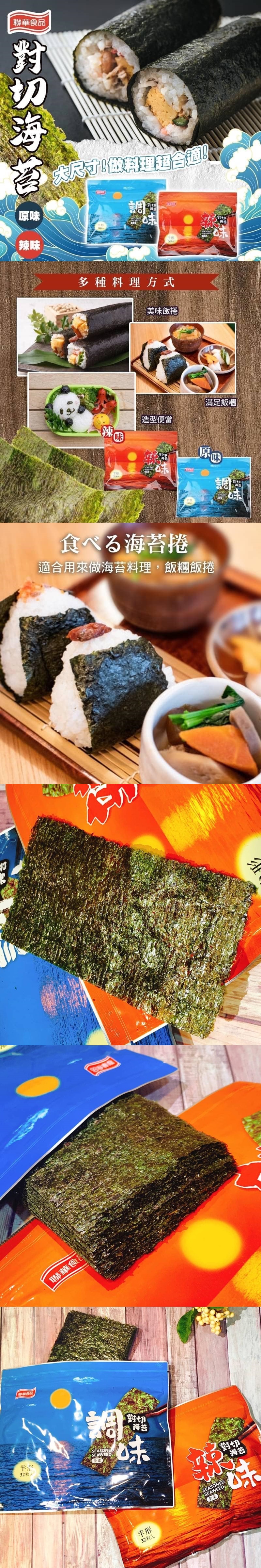 口味:A款:原味B款:辣味不論是坐著吃還是站著吃都很好吃不管是要直接吃還是包著吃都很好吃大人小孩都喜歡吃的聯華海苔隨手挖一口電鍋的白飯包起來就是海苔飯卷隨手放一片在麵裡面就是海苔拉麵海苔不只是配角~ 海苔的健康奇效海苔含有12種維生素,只要一天吃2大片,就可以滿足兒童一天所需的維生素A。可以代替黃綠色蔬菜,幫助兒童維持健康。說到補鐵防貧血,大部份的人會想到肝臟或菠菜,不過其實海苔的鐵含量也很豐富。對於不太敢吃肝臟,或喝牛奶容易過敏的人,海苔是很好的補鐵選擇。海苔含有可以防癌的β胡蘿蔔素現代人容易缺乏鈣與碘等礦物質可以從海苔大量補充,特別適合兒童與孕婦食用。鈣質不只可以維持骨骼健康,還可以舒緩焦躁的情緒。DIY百搭美食,有好吃聯華海苔,萬食能成想要怎麼加就怎麼加