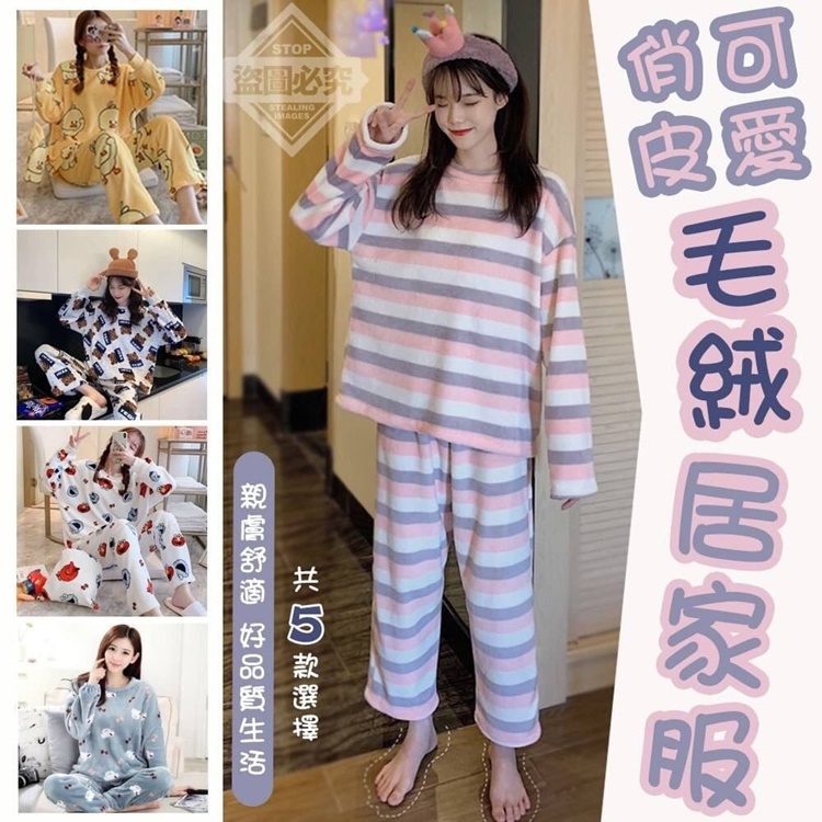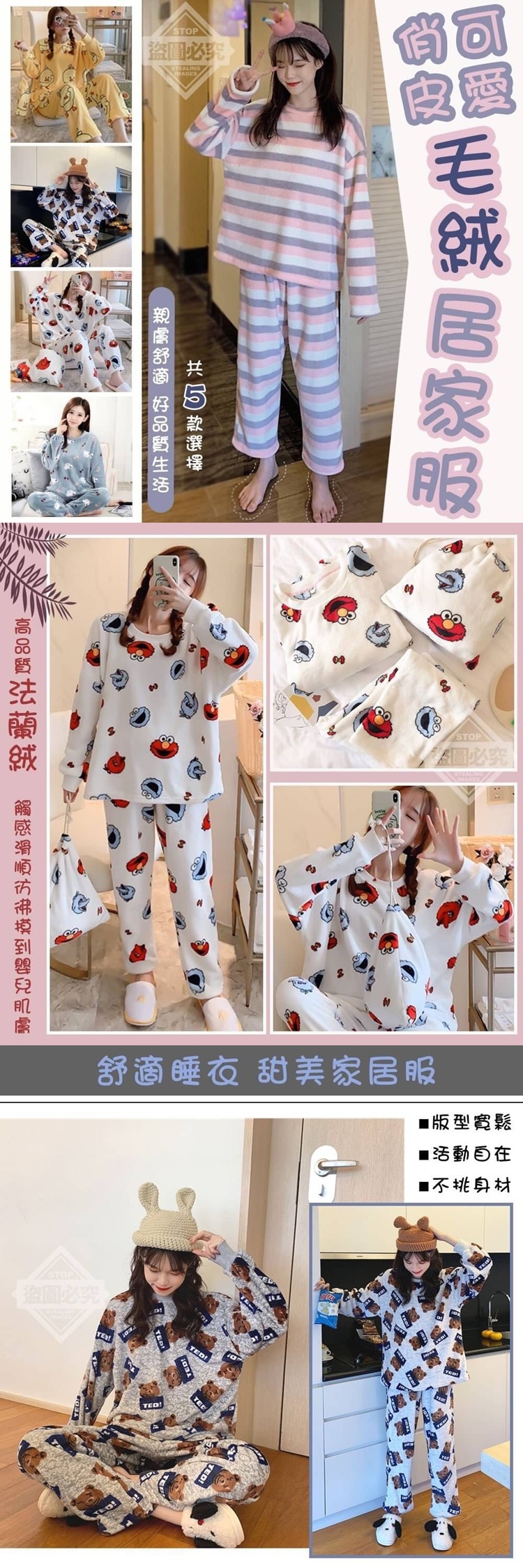商品顏色:粉紫條紋/黃色小鴨/ 灰泰迪熊/芝麻街卡通/灰綠小狗 【商品面料】-絨毛 【商品規格】-上衣+褲子 【商品尺寸】-F均碼 (附贈配件款式數量及顏色隨機出貨, 圖片僅供參考,以實際收到為主。) 【商品說明】- 高品質法蘭絨 觸感滑順 彷彿摸到嬰兒肌膚 耐穿耐磨 不掉色 不起球 肌膚舒適 恆溫保暖 穿上後立即能感受體溫逐漸增加 告別寒涼 溫暖居家 版型寬鬆 活動自在 不挑身材 舒適睡衣 甜美家居服 品味生活 講究質感 性價比超高 俏皮的居家風格 讓你隨時隨地都溫暖可愛
