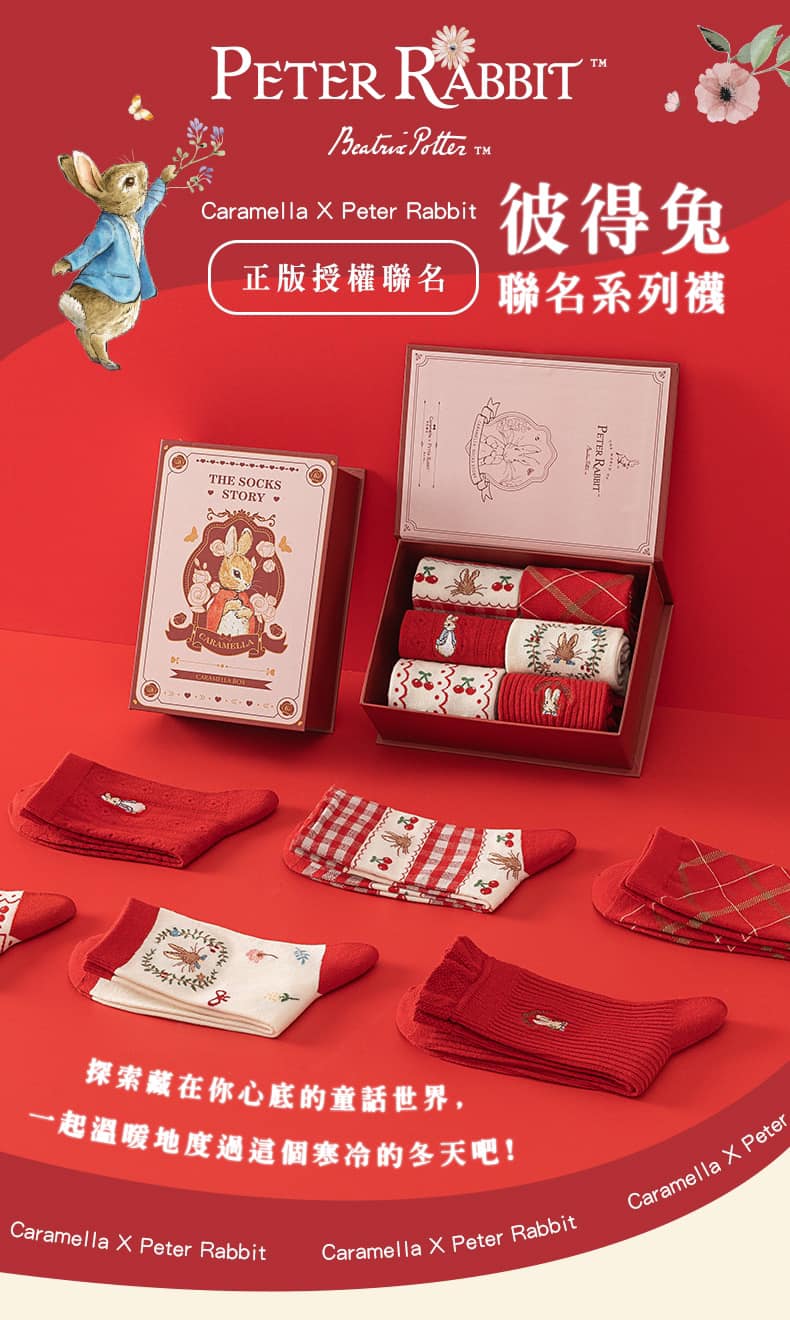 款式 : 女款 A / 女款 B女款 C / 男款 D6雙禮盒裝紅襪,四款可選Caramella X Peter Rabbit正品聯名跨界合作一上市就在亞洲銷售破10萬盒立即再加碼,喜氣新年款Caramella比得兔紅襪一雙有氛圍感的紅襪子!比得兔禮盒裝,拆箱儀式感拉滿!書本式翻蓋+小本子+貼紙呢,送閨蜜,送姐妹,顏值超高