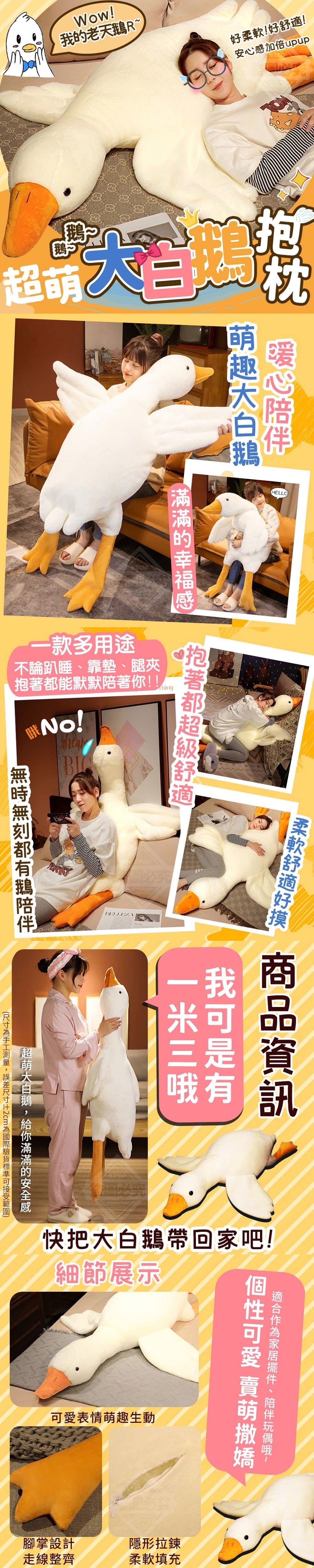 【商品尺寸】-130cm(尺寸為手工測量,誤差尺寸±2cm為國際驗貨標準可接受範圍)【商品說明】-療癒的「大白鵝抱枕」又廢又實用 撫慰大人小孩的心靈給你滿滿的幸福感就這樣守護在妳的身邊給你滿滿的安全感萌趣大白鵝暖心陪伴 大鵝抱枕個性可愛 賣萌撒嬌柔軟舒適好摸一款多用途不論當趴睡、靠墊、腿夾抱著都超級舒適!!無時無刻都有鵝陪伴可愛表情 萌趣生動腳掌設計 走線整齊隱形拉鍊 柔軟填充想選一份生日禮物交換禮物 不如挑這一隻超萌的大白鵝送給你的朋友、小孩或情人吧家居萌物 造型超Q適合作為家居擺件、陪伴玩偶哦~我可是有1米3哦快把大白鵝帶回家吧!影片僅供參考使用方式所有配件以實際收到為主