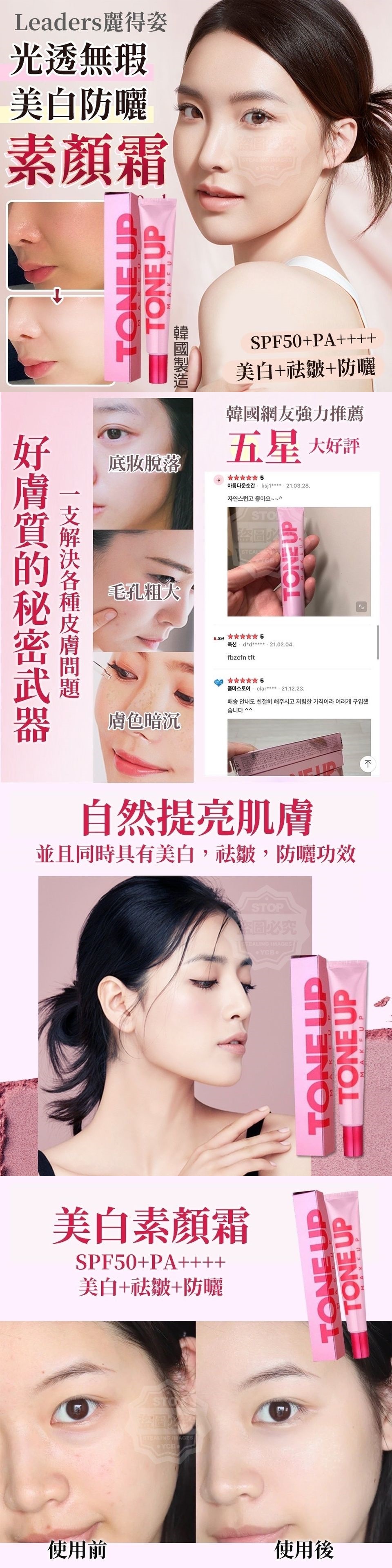 【商品說明】-就連日光燈都有紫外線黑斑暗沈無形之中就是這樣形成的這一款真的太強大集結所有女性此生最在意的問題 直接一次解決提亮膚色 美白 撫平細紋 抗老化最值得關注就是還能防曬~~不要覺得冬天沒太陽就可以省去防曬這件事韓國LEADERS麗得姿素顏霜SPF50+PA++++美白+祛皺+防曬產品介紹可以自然提亮肌膚具有水潤感提亮肌膚的功效含有具有鎮定肌膚的功效成分