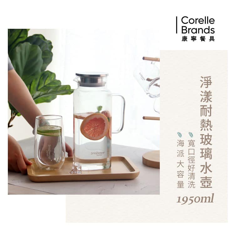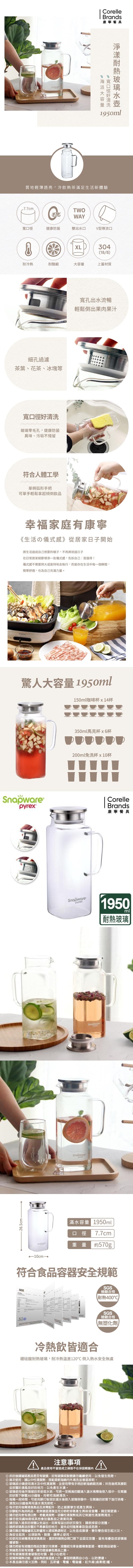 掌聲來一下!團購也可以買到未曝光新品請大家低調低調購買就好!但請大家一定要好好關注一下康寧新品淨漾耐熱玻璃水壺~就是要提升你的生活品質玻璃水壺一直深受台灣人的喜愛~裝在玻璃水壺中的果汁、水就感覺特別好喝又香甜~而康寧這款淨漾耐熱玻璃水壺不管你今天是要裝果汁或者是要泡茶都可以輕鬆從足你的所有需求~304優質不鏽鋼上蓋,不管你盛裝任何飲品都不受限遇熱不會釋出有害物質上蓋雙出水孔設計,細孔過濾茶葉花茶等實孔出水流暢可以讓你輕鬆倒出果肉果汁V型導流品造型,出水順暢可以讓飲品集中不外流,有效防止噴灑寬口徑設計可直接深入水壺清潔髒污,衛生清洗無死角單柄弧形手把符合人體工學,可單手輕鬆拿起倒飲品硼硅酸耐熱玻璃可耐熱400°C並承受15~150°C的瞬間溫差窄身瓶身適合冰箱門側邊置放規格說明:【康寧 Snapware】淨漾耐熱玻璃水壺型號:SN-GP1950尺寸:底徑10*高26.3CM口徑:7.7CM容量:滿水容量1950ML、有效容量1900ML±5%重量:570克±±5%材質:壺身/硼硅酸耐熱玻璃上身/SUS304優質不鏽鋼止水圈/矽膠(食品級/耐熱130°C)****************************