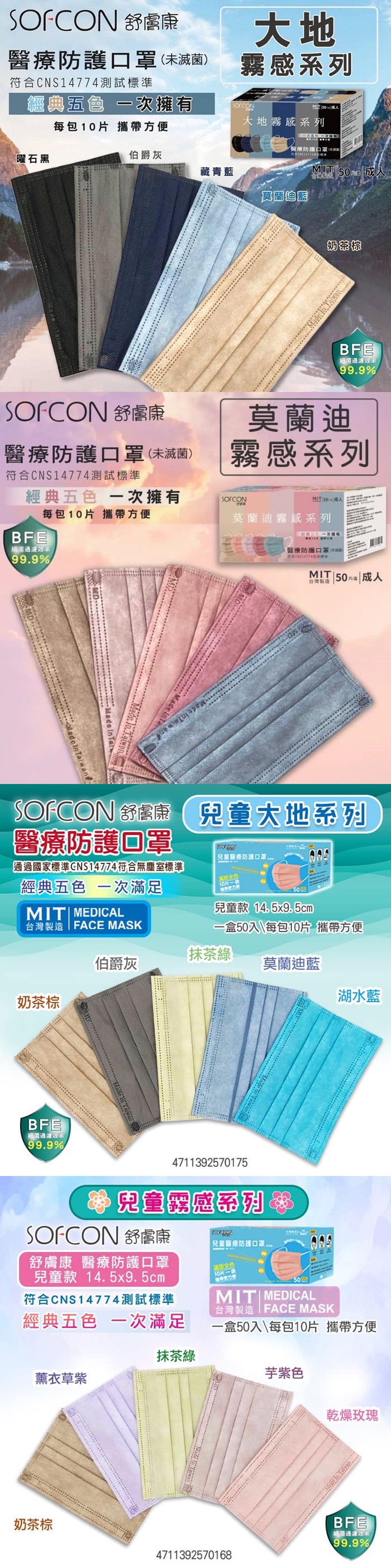 舒膚康平面莫蘭迪霧感系列上市! 有選擇障礙的人看過來! 想要每週5天上班有不同顏色的口罩戴,又不想花大錢一次買5盒的帥哥美女們看過來! 舒膚康都幫你們想好了! 精選霧感柔美5色和紳士5色混裝一盒,每色10片! 美女選莫蘭迪組合! 帥哥選大地組合! 不用東挑西選! 不用一次買5盒! 只要+1就搞定! 同場加映兒童霧感系列、兒童大地系列 即將開學,口罩必備 女寶選霧感系列,男寶選大地系列