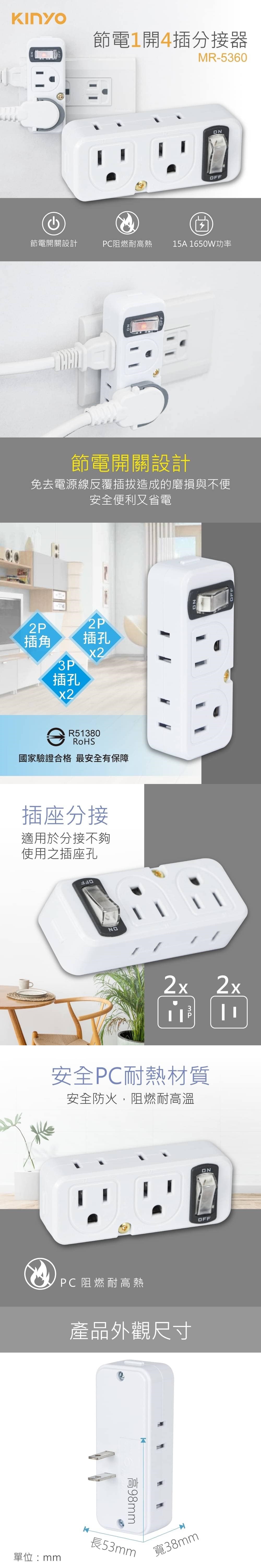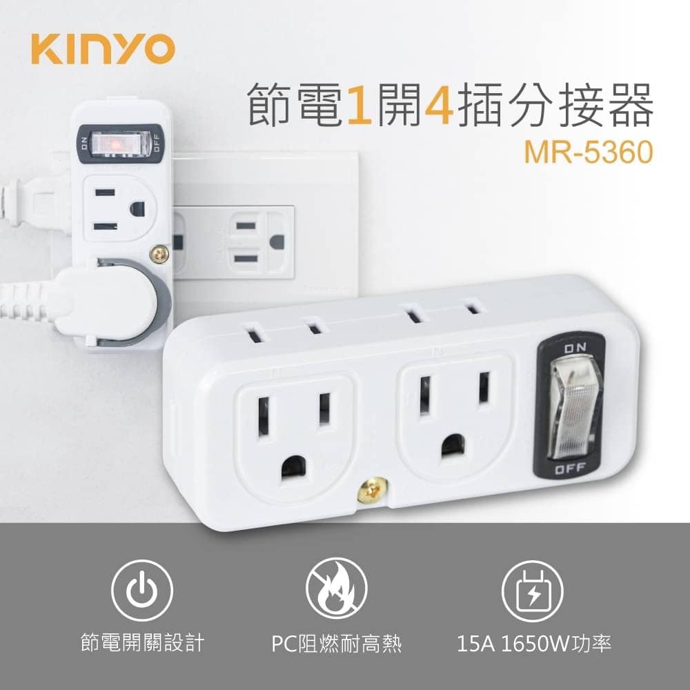 KINYO 節電1開4插分接器 (MR-5360)家用電器和3C電子產品越來越多只想充個電,總是要站在插座前,抉擇該拔哪個插頭來使用來來來~有了KINYO 節電1開4插分接器輕輕鬆鬆幫你解決插座不足的困擾