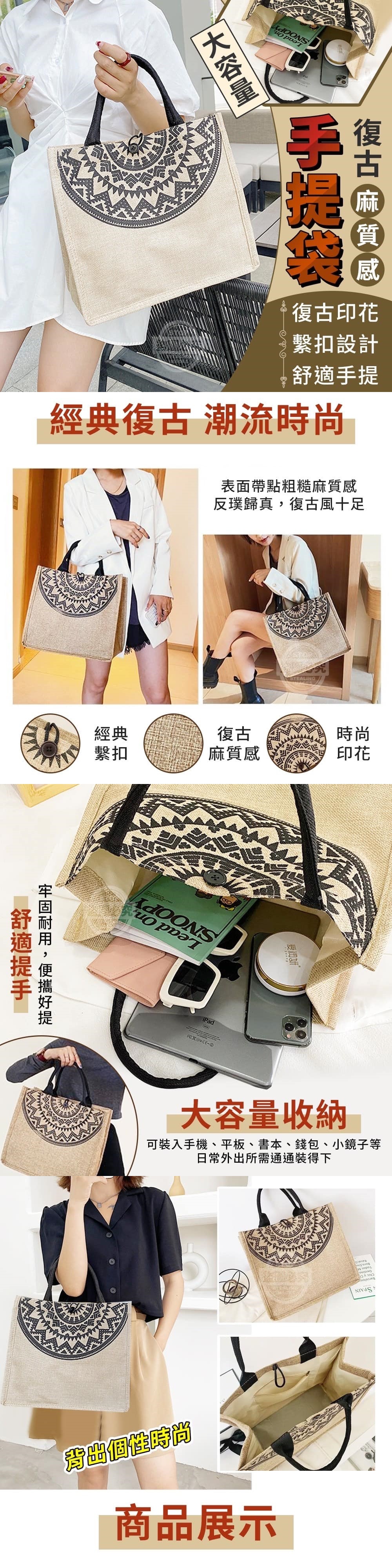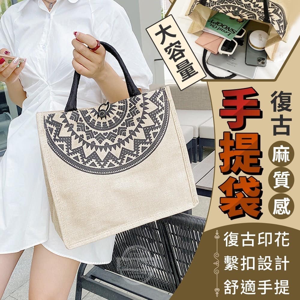 【商品材質】-帆布【商品尺寸】-33*30*17cm尺寸為手工測量,誤差尺寸±2cm為國際驗貨標準可接受範圍【商品包裝】-袋裝【商品說明】-經典復古,潮流時尚大容量復古麻質感手提袋外出用餐、出門買個東西、逛街都超需要這種隨手提著走的包包復古麻質感搭配時尚印花表面帶點粗糙麻質感反璞歸真,復古風十足大容量收納可裝入手機、平板、書本、錢包、小鏡子等日常外出所需通通裝得下經典繫扣可繫住提袋讓東西不易掉出來舒適提手牢固耐用,便攜好提可手拿或肩背讓你隨易背出個性時尚俐落剪裁更顯雅緻質感真的超實用出行輕便無負擔