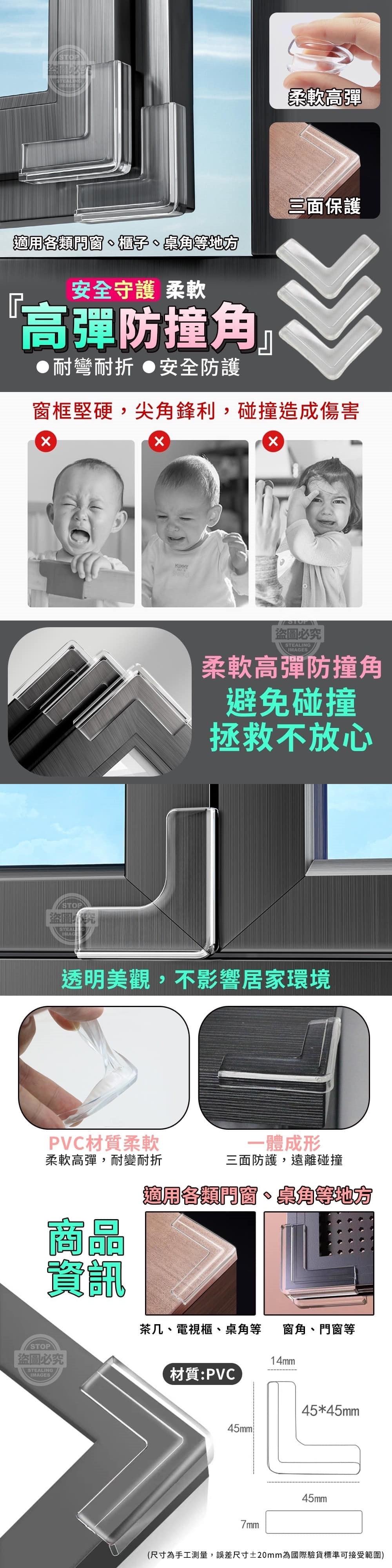 【商品材質】-PVC【商品尺寸】-45x45mm(尺寸為手工測量,誤差尺寸±20mm為國際驗貨標準可接受範圍)【商品顏色】-透明白(附贈配件款式數量及顏色隨機出貨,圖片僅供參考,以實際收到為主。)【商品包裝】-OPP【商品說明】-窗框堅硬,尖角鋒利小朋友一不小心碰撞就會造成傷害安全守護柔軟高彈防撞角一體成形,三面防護!讓你與家人遠離碰撞危險!使用PVC材質柔軟柔軟高彈,耐變耐折不易變形透明美觀安裝任何地方不影響居家環境適用各類窗角、門窗、茶几、電視櫃、桌角等地方只要是尖銳直角的地方都可安裝柔軟高彈防撞角避免碰撞,拯救不放心