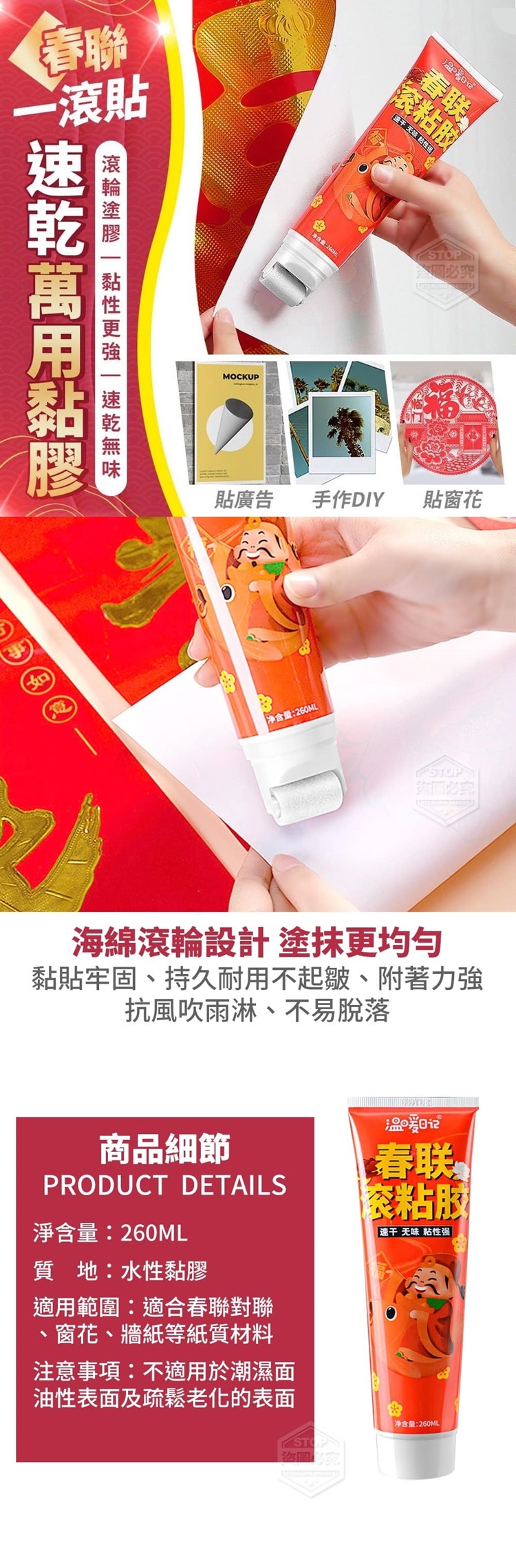 【商品容量】-260ml 【商品說明】- 春聯一滾貼速乾萬用黏膠 海綿滾輪設計,塗抹更均勻 不易弄髒手,使用更順心 黏貼牢固,拒絕脫落 持久耐用不起皺,附著力強 抗風吹雨淋、不易脫落 使用更廣泛 一支膠多用途 春聯、海報、窗戶裝飾等各場景都能用 晶瑩剔透 淨味環保 環保配方,無毒無味使用安心 免除清潔的煩惱 撕下無痕,不留殘膠 滾輪塗膠 黏性更強 速乾無味 影片僅供參考使用方式 所有配件以實際收到為主