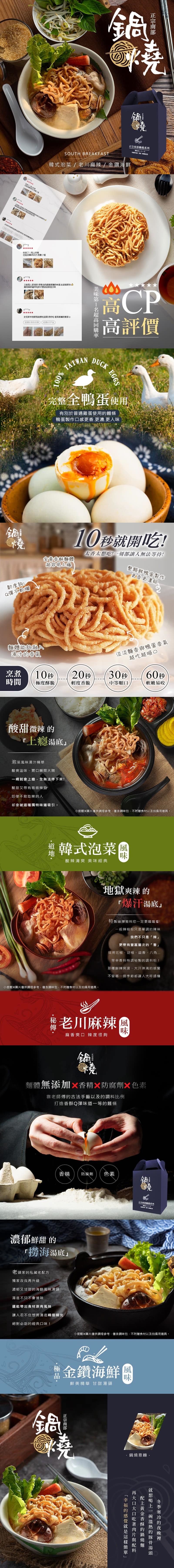 台灣產全鴨蛋製作!跟一般雞蛋做的麵口感很不同喔!口感更香也更濃郁半夜肚子餓的前胸貼後背一包3分鐘快煮!這種麵的特色是能夠融入湯頭的香所以我喜歡搭配濃郁豚骨湯或昆布高湯齁~冬尤其天的時候熱騰騰的湯頭與金黃酥鬆的麵條再加上滿滿豬肉片與青蔥提味咻~一口下肚整個超享受!大半夜吃個麵居然也能吃出「幸福感」極度推薦你們一定要試試看!!!無添加任何香精防腐劑無添加色素~不靠任何化學調料很厲害!靠單純調料比例與古法手藝 就讓麵條這麼與眾不同!台灣產 完整全鴨蛋使用
