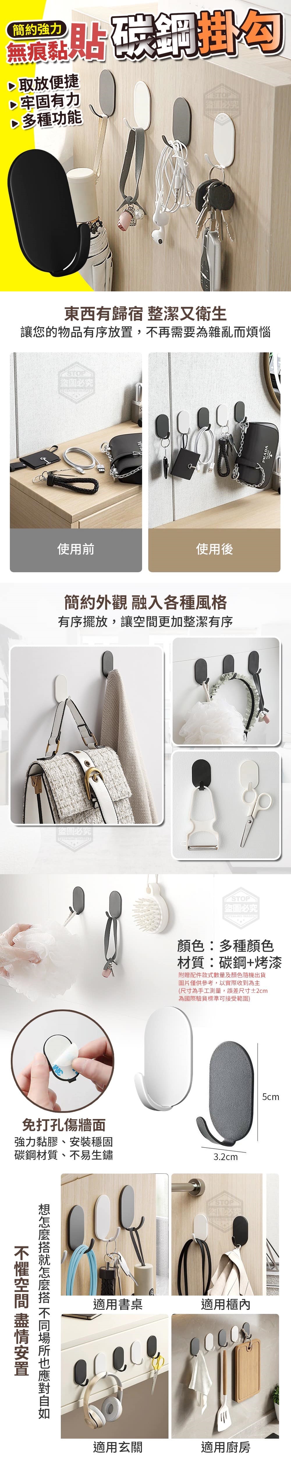 顏色隨機【商品材質】-碳鋼+烤漆【商品尺寸】-3.2X5CM(尺寸為手工測量,誤差尺寸±2CM為國際驗貨標準可接受範圍)【商品顏色】-多種顏色附贈配件款式數量及顏色隨機出貨,圖片僅供參考,以實際收到為主。【商品包裝】-袋裝【商品說明】-東西有歸宿 整潔又衛生!簡約強力無痕黏貼碳鋼掛勾讓您的物品有序放置不再需要為雜亂而煩惱為您的生活提供便利和整潔!強力黏貼,免打孔傷牆面可以在不損壞牆面的前提下穩固地黏貼掛勾,讓您的家居保持完美的外觀安裝穩固,牢牢承載,讓您無後顧之憂簡約設計,能夠輕鬆融入各種室內風格。不僅可以用於掛衣物、帽子等日常用品還可以在廚房、浴室等地方發揮作用為您的生活帶來便捷多用途應用,無處不在讓您的生活更加輕鬆便捷享受無處不在的便利和整潔!