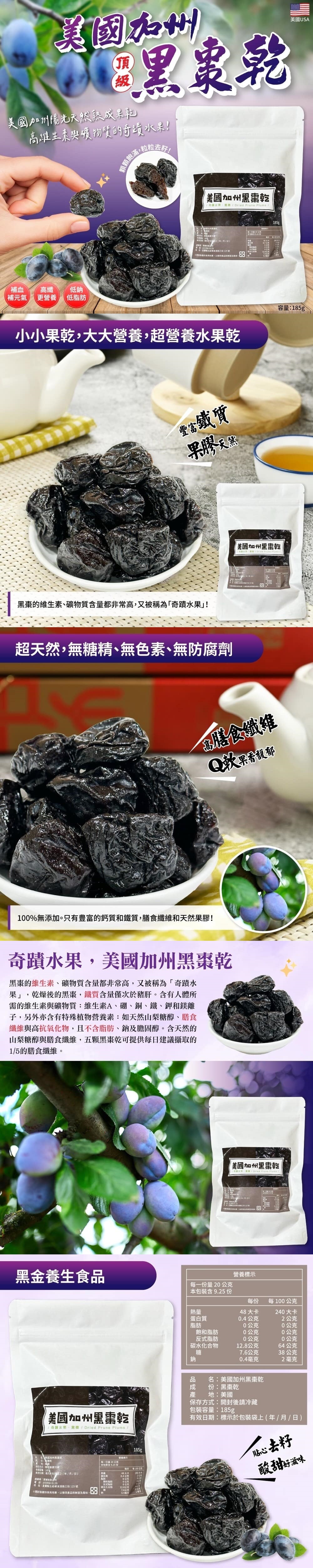 黑棗被譽為「奇蹟水果」在忙碌的現代生活中我們常常需要一些方便的食品來補充健康營養和元氣頂級美國加州黑棗乾選用美國加新鮮黑棗乾燥後更是具有出色的營養價值因此倍受美國當地人喜愛黑棗富含維生素和礦物質其中的鐵質含量僅次於豬肝與造血功能密切相關美國加州黑棗乾經過去籽處理更加貼心方便讓您能夠輕鬆享受黑棗的營養益處這款黑棗乾具有高纖維的特點不僅能夠提供您所需的營養還能促進腸道蠕動,使排便順暢它富含膳食纖維和天然果膠不管您是在辦公室工作外出旅行還是在家中休息這款美國加州黑棗乾都是您的理想選擇它方便攜帶,可隨時隨地享用!品名:美國加州黑棗乾成份:黑棗乾產地:美國保存方式:開封後請冷藏包裝容量:185g有效日期:標示於包裝袋上(年/月/日)
