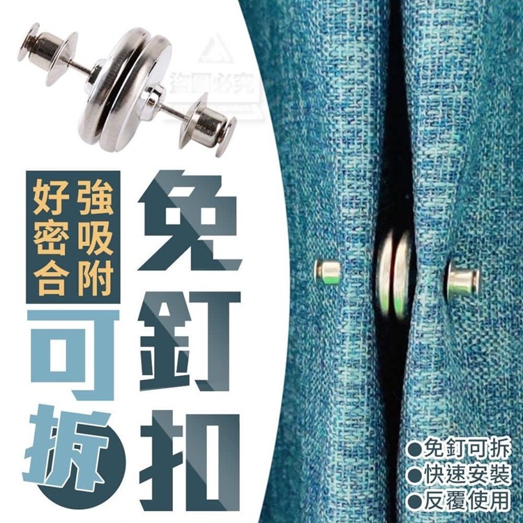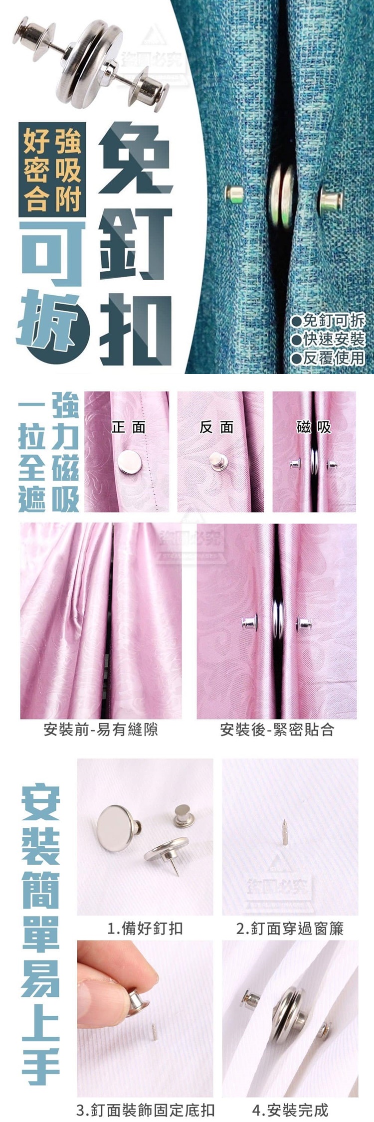 【商品說明】- 窗簾合不起來,好怒!!!! 強吸附好密合可拆免釘扣 輕鬆安裝,解決無法密合的困擾 強力吸附 吸合緊密 強磁吸附,免釘免拆,可反覆使用 操作便捷 輕鬆使用 無須繁瑣安裝步驟,靠近即可吸附 強力磁吸 一拉全遮 窗簾輕鬆閉合,陽光遮蔽免煩惱 安裝簡單易上手 1.備好釘扣 2.釘面穿過窗簾 3.釘面裝飾固定底扣 4.安裝完成 免釘可拆 快速安裝 反覆使用 影片僅供參考使用方式 所有配件以實際收到為主