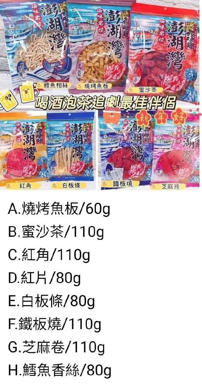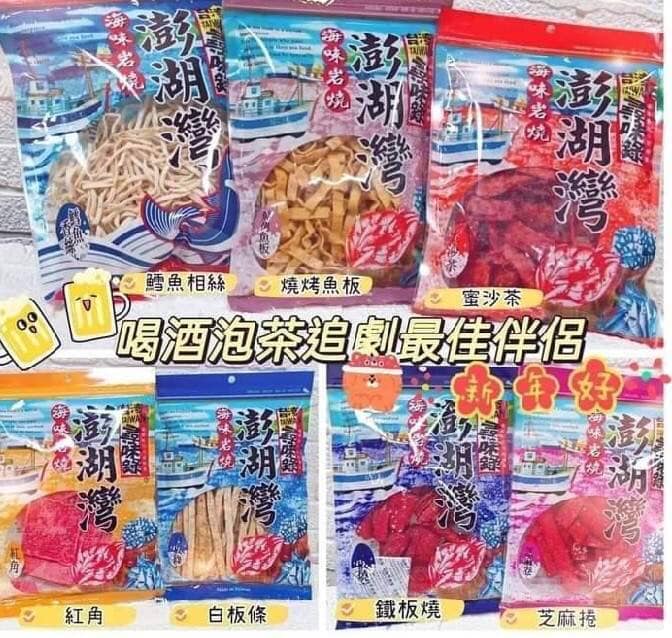 口味:紅角 /紅片 / 芝麻捲 / 蜜沙茶 / 鐵板燒 /白板條/鱈魚香絲/燒烤魚板 從小最愛吃的古早味 大豬公還記得嗎? 現在海味系列不用去旗津,在這裡也能買到歐 喝酒 泡茶 追劇 聊天最佳伴侶 來自台灣嚴選魚漿製成 濃濃海味的休閒小品,香Q帶勁, 讓人越嚼越香越好吃 是大家童年回憶中的古早零嘴~ 夾鏈袋包裝,保存容易 適合朋友聚會分享,看電影、追劇、 旅行、同樂會、泡茶、下酒通通都對味