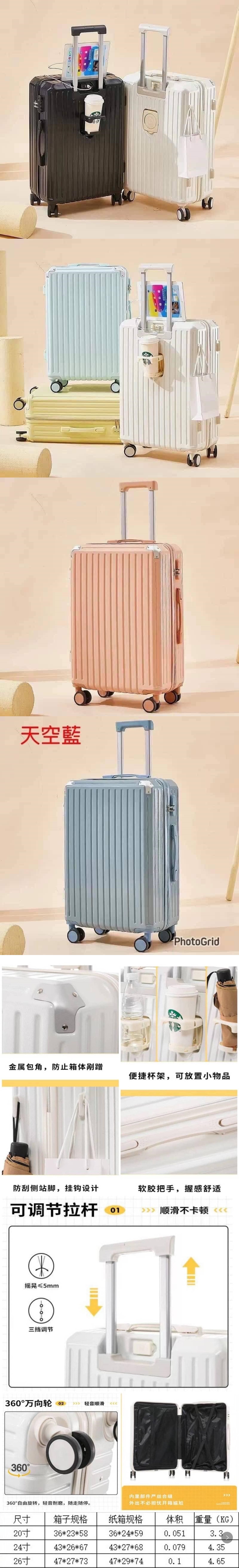 許願第二團 最新款行李箱 顏色:黑、白、櫻花粉、檸檬黃、天空藍、冰川藍 廠商釋出近5折優惠只有一團 內建USB接口,不用把行動電源拿再手上費力 防水、防盜、防刮擦 掛鉤設計、杯架設置真的太貼心好用了 材質:ABS+PC 輪子樣式:萬向輪 輪子類型:雙輪 超大容量,輕鬆收納所有行李,讓出門旅行再也不用為行李不夠帶而發愁啦! 而且還有多種顏色可供選擇,讓你的旅行更加有風格。 想要讓旅途更加輕鬆愉快?那就趕快來挑選你喜歡的款式吧!